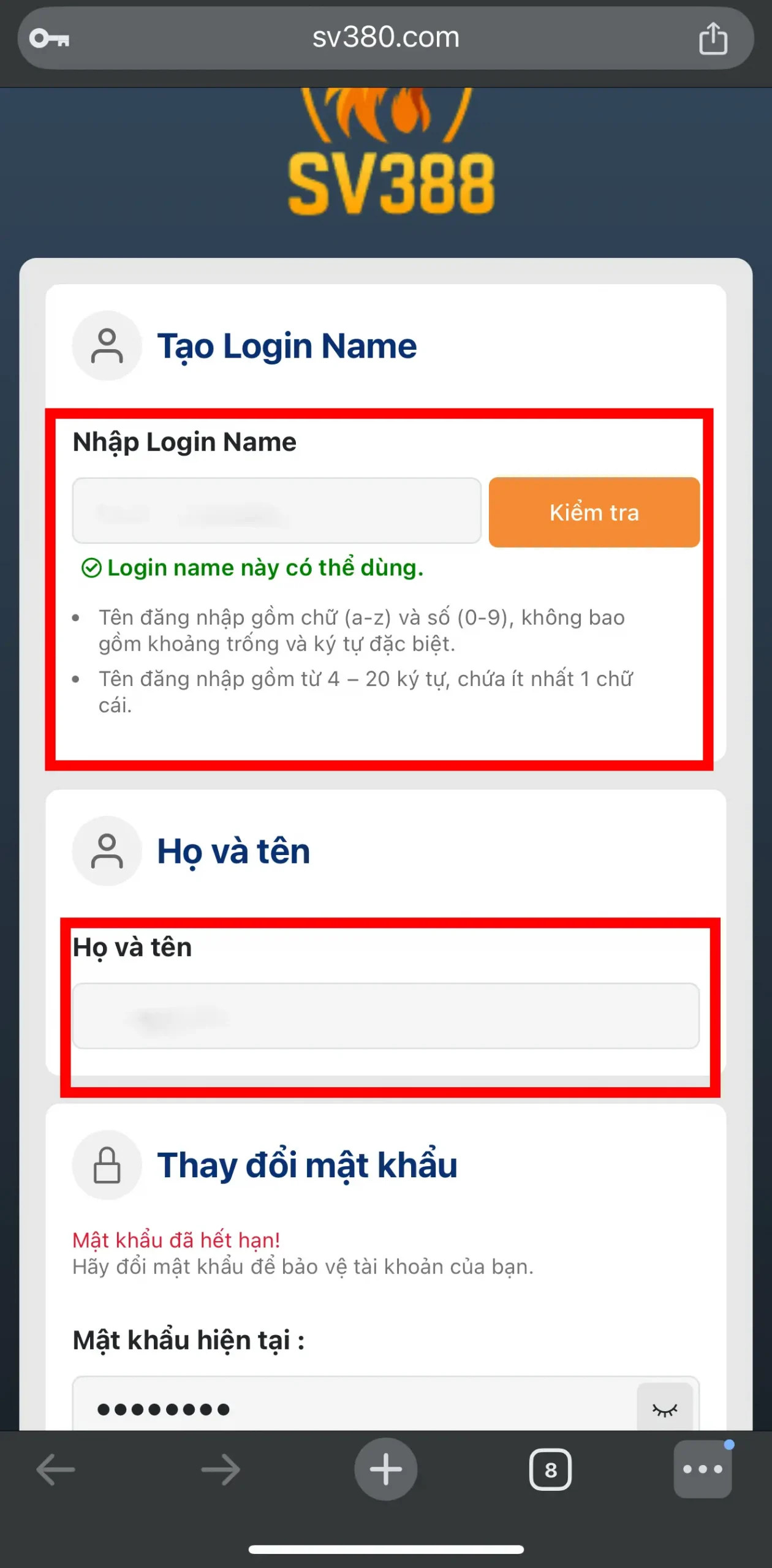 Sau khi đăng nhập SV388 thành công, hệ thống sẽ chuyển bạn đến mục đổi mật khẩu và xác nhận thông tin tài khoản cược.