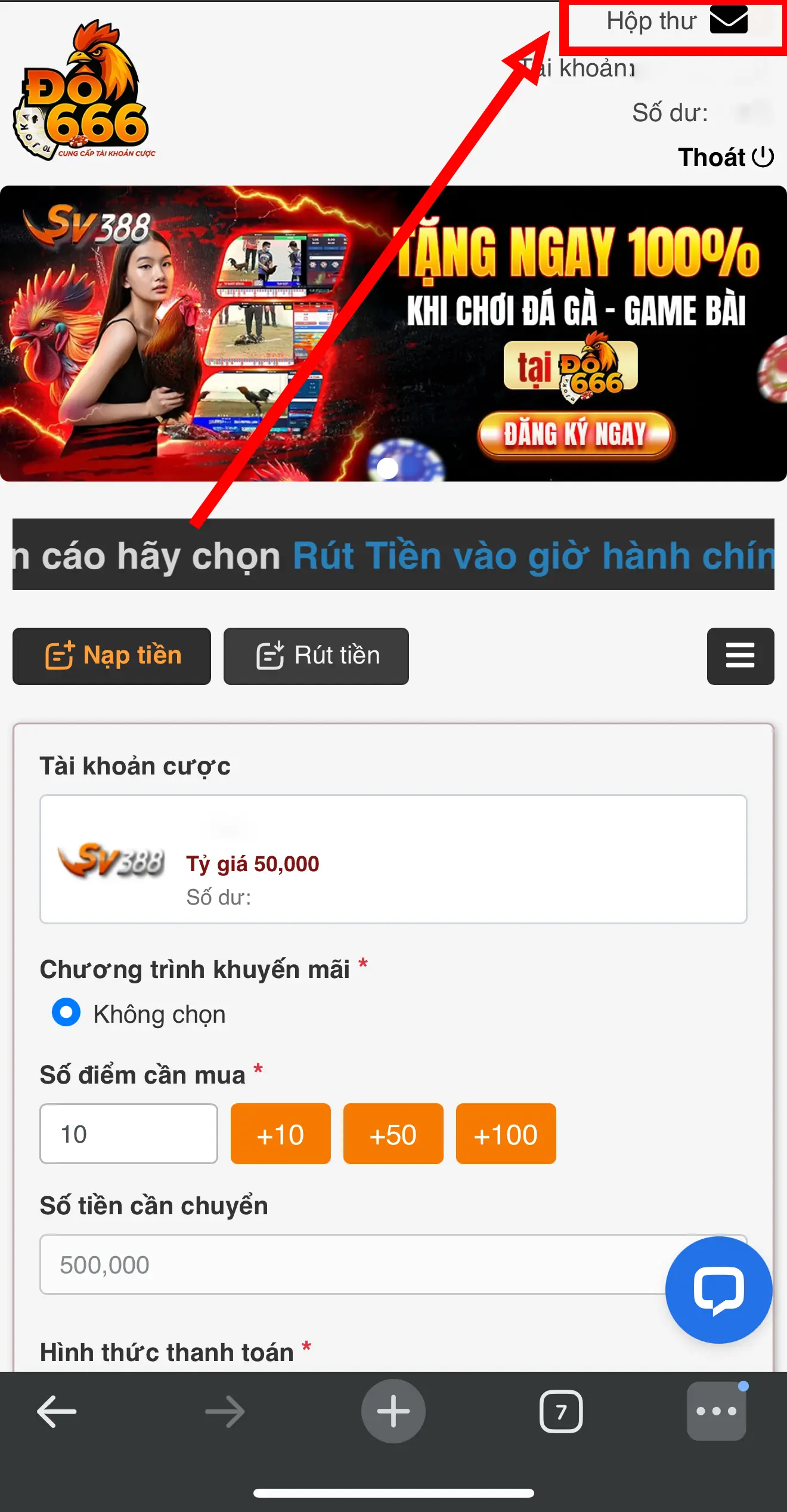 Để có tài khoản SV388, bạn cần có tài khoản ĐÔ666. Nếu chưa có bạn có thể vào trang chủ của ĐÔ666 để bắt đầu quá trình đăng ký sau đó hãy đăng nhập và nhấn vào mục [Nạp Tiền]