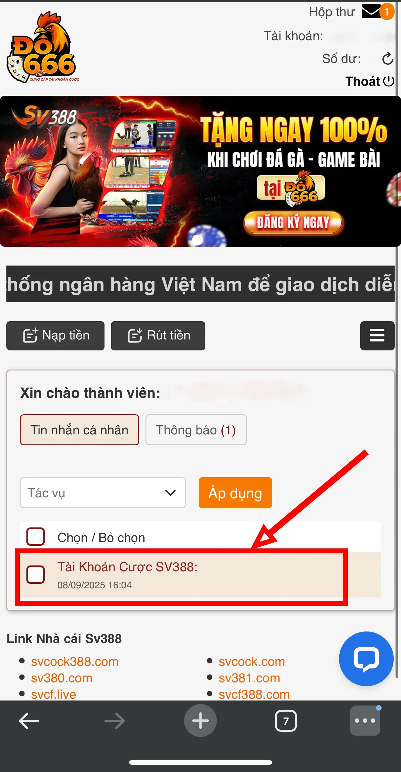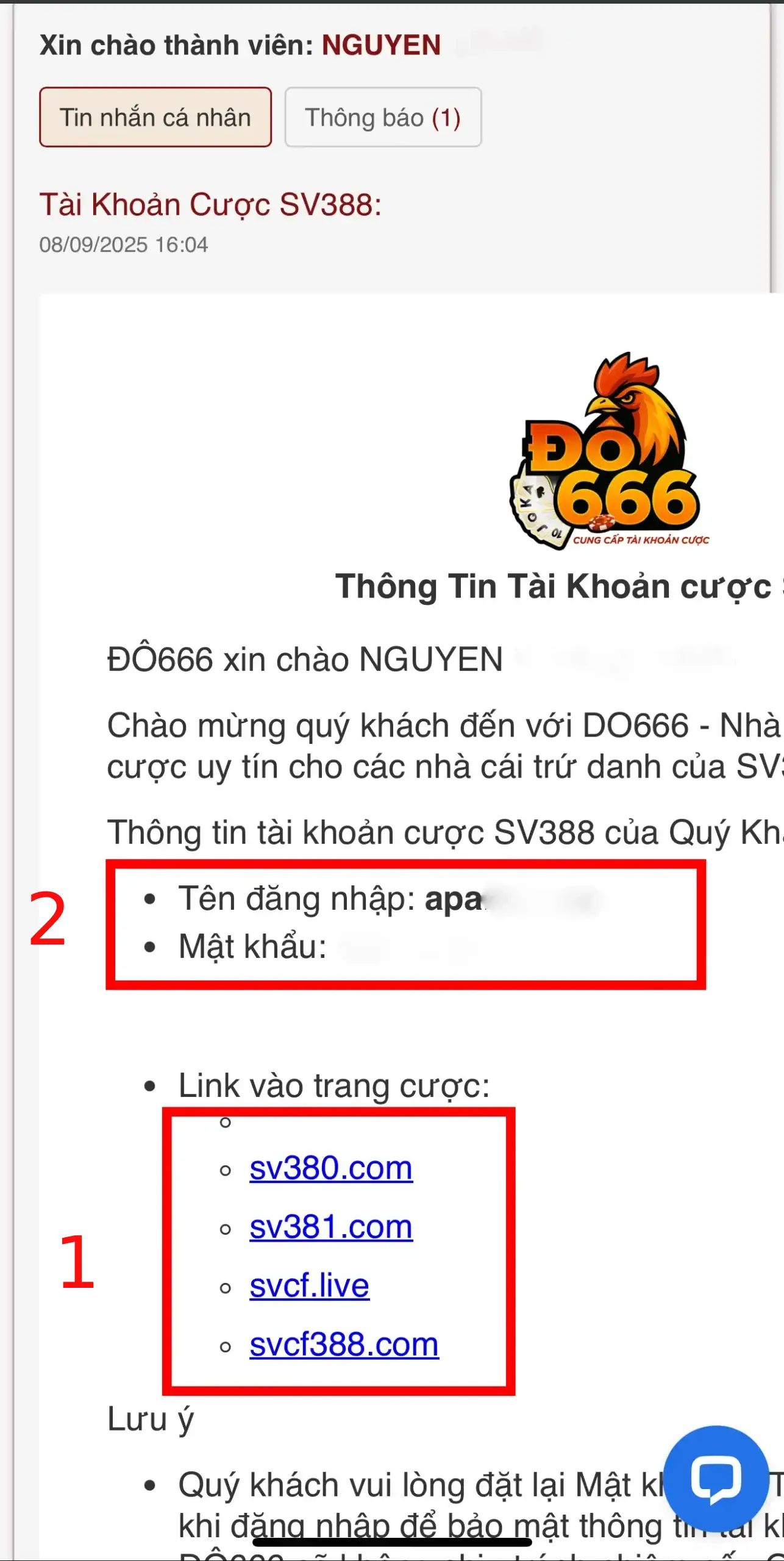 Sau khi nhấp vào mục [Thông Báo], bạn sẽ thấy được thông báo tài khoản cược SV388 chính chủ của bạn khi đăng ký tài khoản Đô666. Chỉ cần bạn nạp tiền tại ĐÔ666, người chơi có thể dùng tài khoản này để đặt cược trực tiếp trên hệ thống SV388.