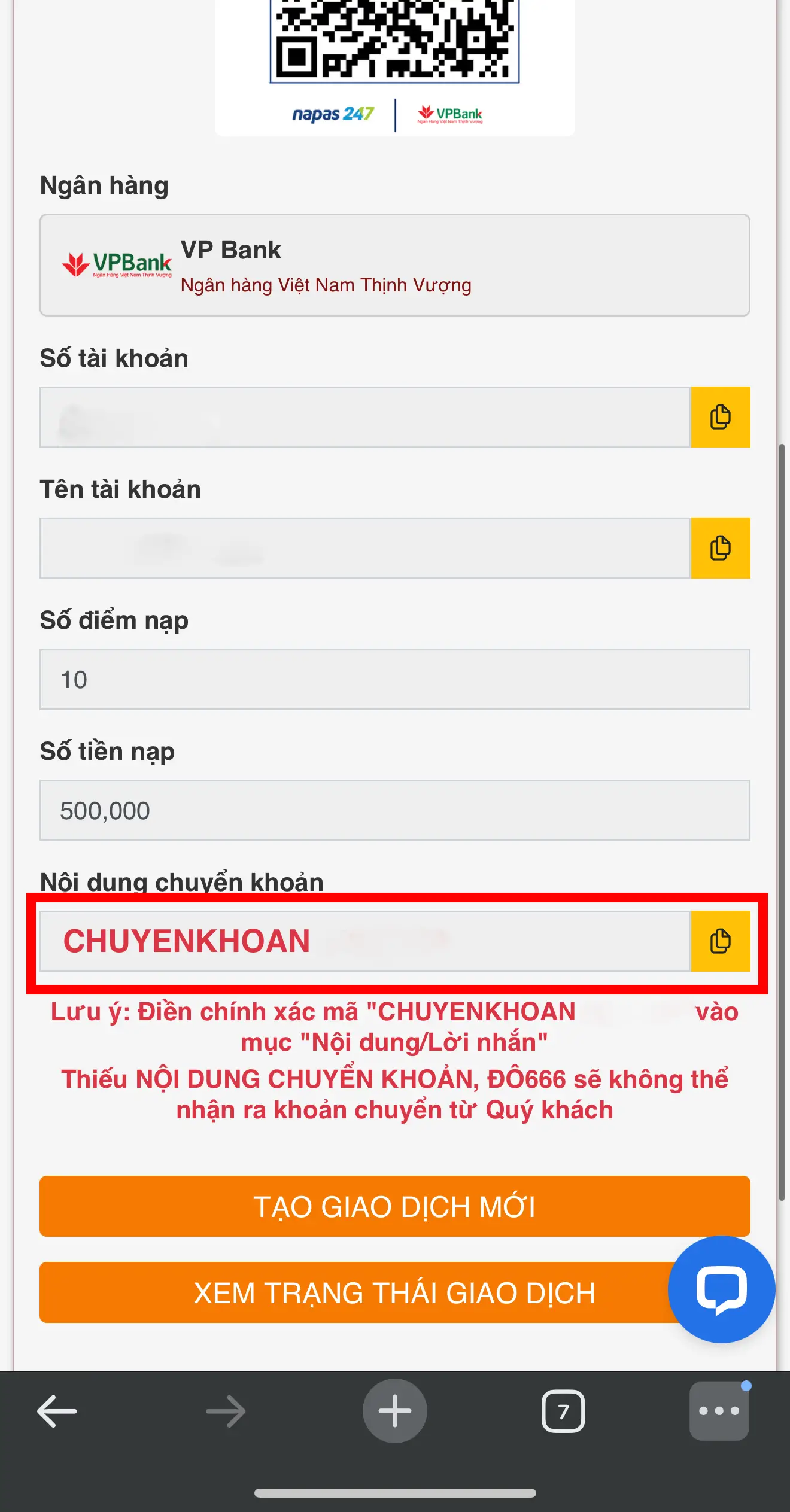 Sau khi hoàn tất các mục, bạn chọn [Tạo lệnh nạp tiền] để tiến hành thanh toán. Tại bước chuyển khoản bạn nhập các thông tin giao dịch của ĐÔ666 và chuyển tiền tại ngân hàng của bạn. Lưu ý: Nhập đúng nội dung giao dịch để nhà cung cấp có thể tiến hành thanh toán cho bạn nhanh hơn.